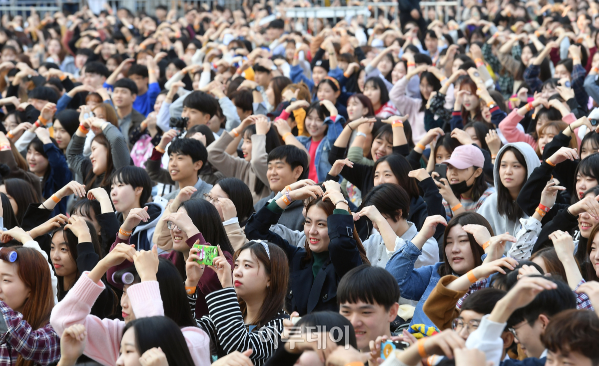 청춘을 위한 복합문화 페스티벌 '청춘아레나'가 28일 인천 남구 문학경기장에서 열린 가운데 관람객들이 볼빨간 사춘기의 공연을 보며 머리 위로 하트를 그리고 있다. 이동근 기자 foto@