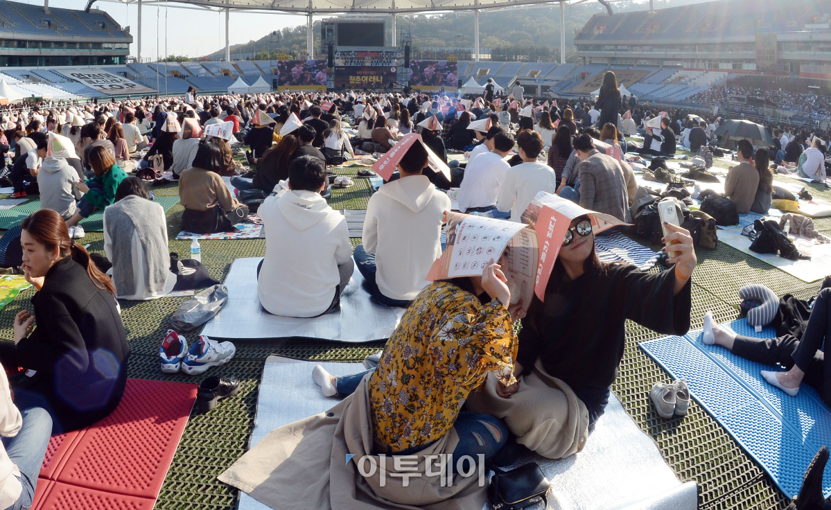 청춘을 위한 복합문화 페스티벌 '청춘아레나'가 28일 인천 남구 문학경기장에서 열린 가운데 관람객들이 셀카를 찍으며 행사를 즐기고 있다. 이동근 기자 foto@