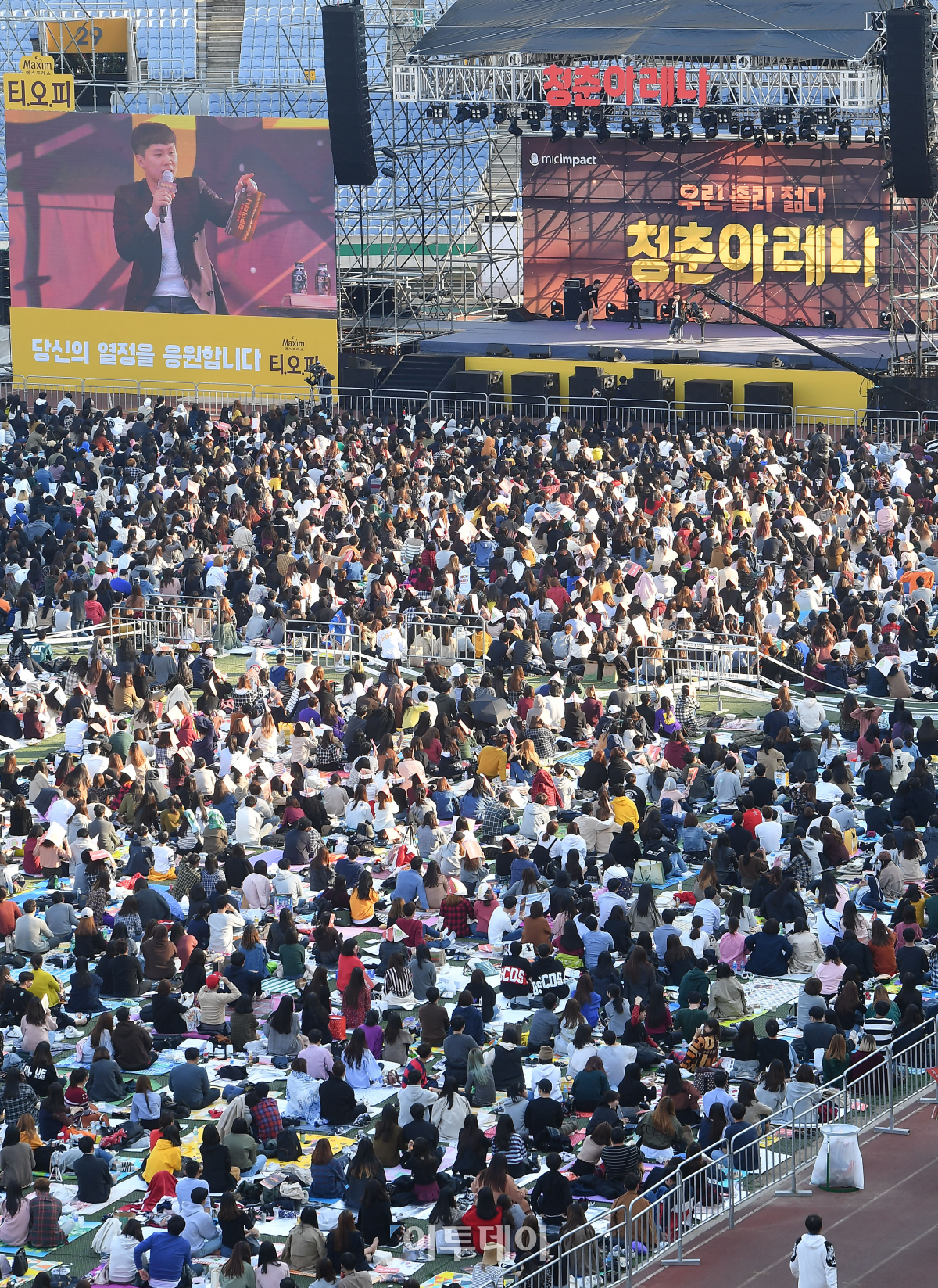 청춘을 위한 복합문화 페스티벌 '청춘아레나'가 28일 인천 남구 문학경기장에서 열린 가운데 개그맨 양세형이 관객들과 대화하고 있다. 이동근 기자 foto@