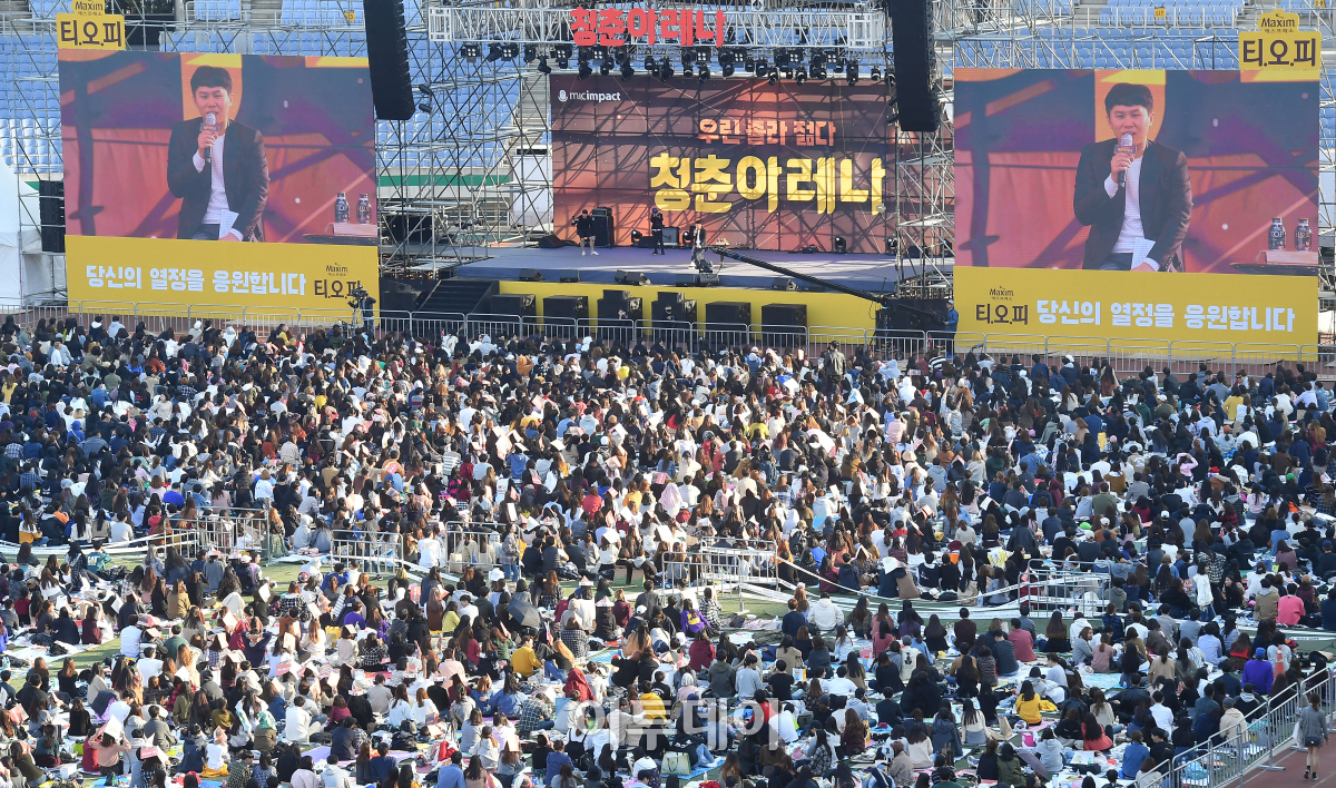 청춘을 위한 복합문화 페스티벌 '청춘아레나'가 28일 인천 남구 문학경기장에서 열린 가운데 개그맨 양세형이 관객들과 대화하고 있다. 이동근 기자 foto@