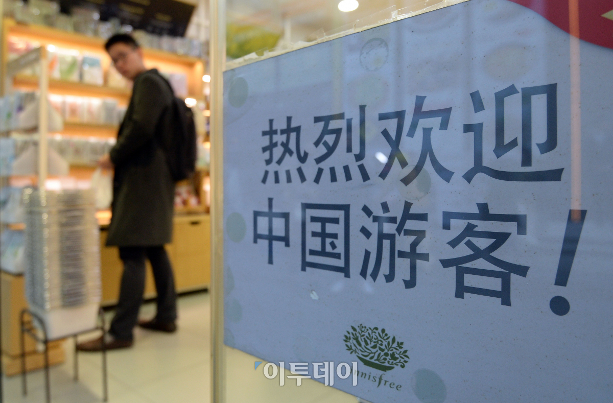 중국의 새 지도부 출범 이후 사드배치로 얼어붙었던 한-중관계에 해빙 분위기가 조성되고 있는 가운데 30일 서울 명동의 한 매장에 중국 여행객을 환영하는 내용의 문구가 붙어 있다. 최근 중국 내 최대 온라인 여행사이트인 씨트립이 한국 여행상품 검색을 다시 허용했고, 저가항공사들이 한국행 노선의 운항을 재개하거나 확대하려는 움직임이 나타나 유통·관광업계의 기대감이 커지고 있다. 이동근 기자 foto@