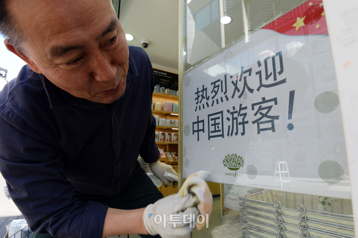중국의 새 지도부 출범 이후 사드배치로 얼어붙었던 한-중관계에 해빙 분위기가 조성되고 있는 가운데 30일 서울 명동의 한 매장에서 직원이 중국 관광객을 환영하는 문구가 부착된 유리창을 닦으며 손님 맞을 준비를 하고 있다. 최근 중국 내 최대 온라인 여행사이트인 씨트립이 한국 여행상품 검색을 다시 허용했고, 저가항공사들이 한국행 노선의 운항을 재개하거나 확대하려는 움직임이 나타나 유통·관광업계의 기대감이 커지고 있다. 이동근 기자 foto@