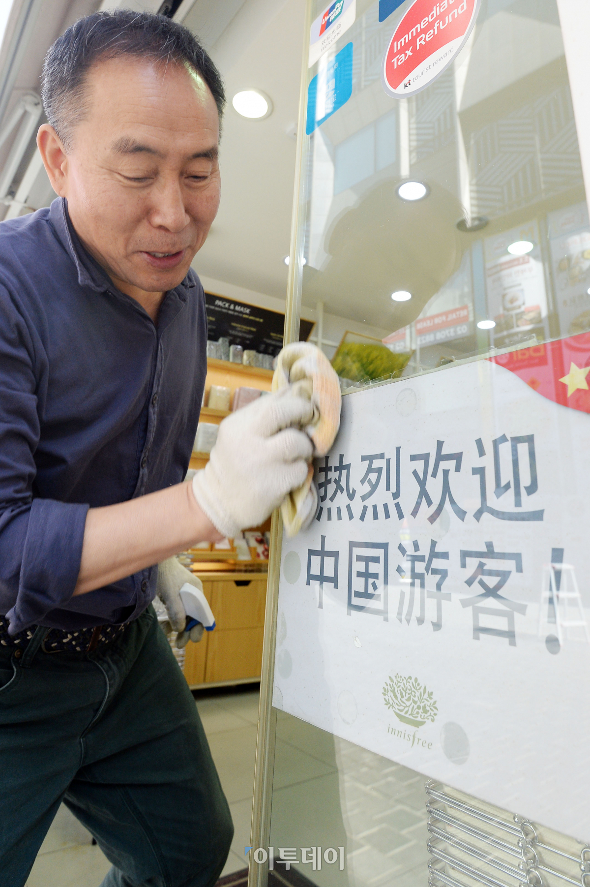 중국의 새 지도부 출범으로 사드배치로 얼어붙었던 한-중관계에 해빙 분위기가 조성되고 있는 가운데 30일 서울 명동의 한 매장에서 직원이 중국 관광객을 환영하는 문구가 부착된 유리창을 닦으며 손님 맞을 준비를 하고 있다. 최근 중국 내 최대 온라인 여행사이트인 씨트립이 한국 여행상품 검색을 다시 허용했고, 저가항공사들이 한국행 노선의 운항을 재개하거나 확대하려는 움직임이 나타나 유통·관광업계의 기대감이 커지고 있다. 이동근 기자 foto@