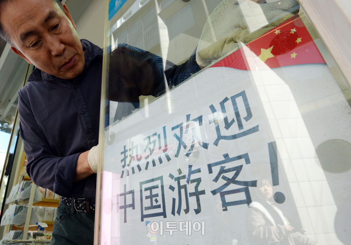중국의 새 지도부 출범으로 사드배치로 얼어붙었던 한-중관계에 해빙 분위기가 조성되고 있는 가운데 30일 서울 명동의 한 매장에서 직원이 중국 관광객을 환영하는 문구가 부착된 유리창을 닦으며 손님 맞을 준비를 하고 있다. 최근 중국 내 최대 온라인 여행사이트인 씨트립이 한국 여행상품 검색을 다시 허용했고, 저가항공사들이 한국행 노선의 운항을 재개하거나 확대하려는 움직임이 나타나 유통·관광업계의 기대감이 커지고 있다. 이동근 기자 foto@