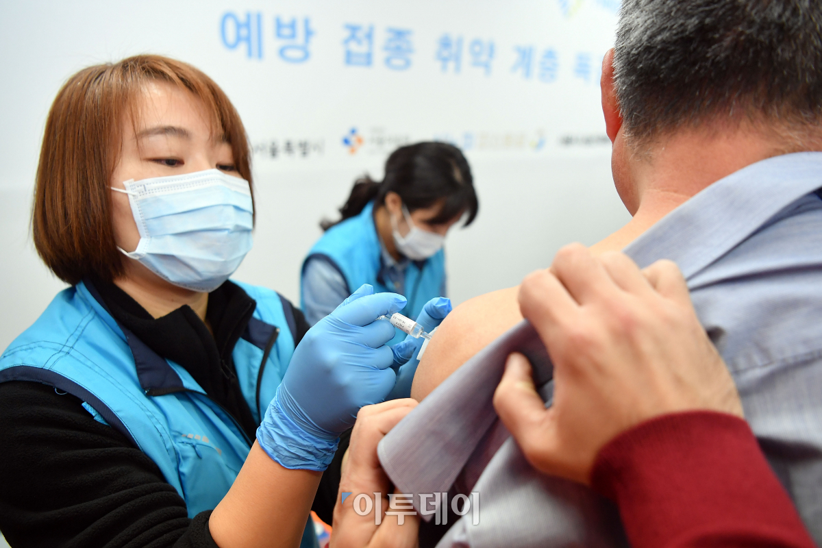 31일 서울 동자동 노숙인 무료 급식소 '따스한 채움터'에서 서울시와 민간 기관이 뜻을 모아 노숙인 및 취약계층의 건강한 겨울나기를 위한 무료 독감예방접종을 실시하고 있다. 이동근 기자 foto@