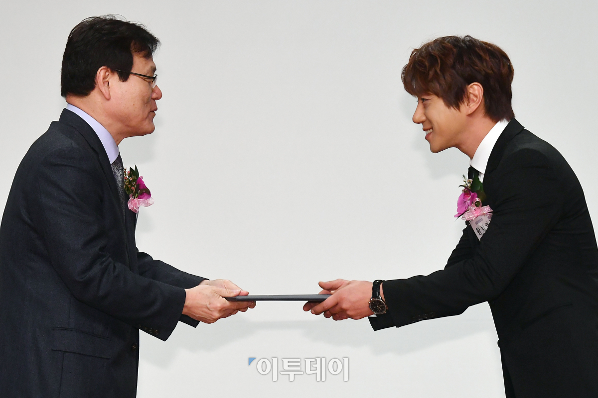 최종구 금융위원장이 31일 서울 여의도 63컨벤션에서 열린 제2회 금융의 날 기념식에서 가수 황치열 씨에게 금융위원장 표창을 수여하고 있다. 이동근 기자 foto@