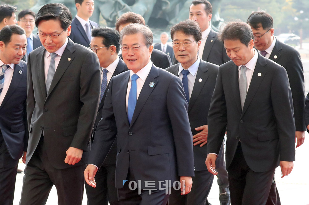 문재인 대통령이 1일 오전 서울 영등포구 여의도 국회에 내년도 예산안 국회 본회의 상정에 따른 시정연설을 위해 들어서고 있다. 국회사진취재단