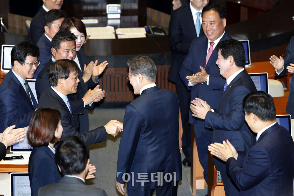 문재인 대통령이 1일 오전 서울 여의도 국회 본회의장에 시정연설을 위해 입장하며 의원들로부터 박수를 받고 있다. 국회사진취재단