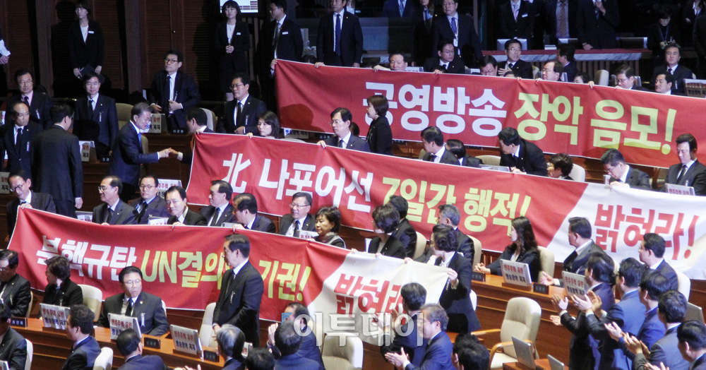[포토]항의 플랜카드 든 '자유한국당'에게 손 내미는 '문재인 대통령'
