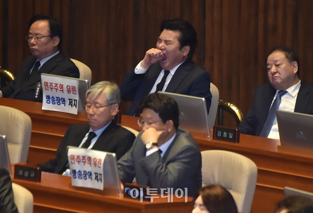 문재인 대통령이 1일 오전 서울 여의도 국회 본회의장에서 429조원 규모의 2018년도 예산안 및 새 정부 국정과제 이행을 위한 개혁법안 통과를 당부하며 시정연설을 하는 가운데, 자유한국당 의원들이 지루한 표정을 짓고 있다. 국회사진취재단