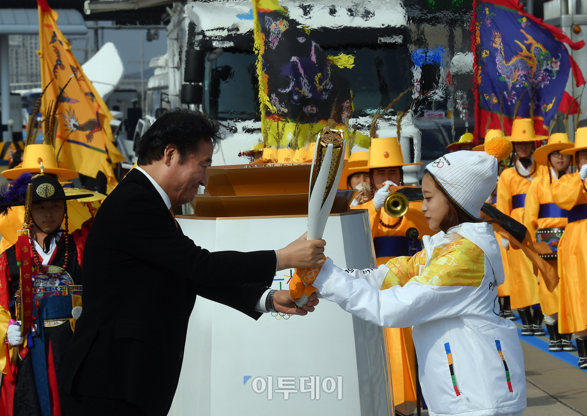 2018 평창동계올림픽을 100일 앞둔 1일 올림픽 성화가 한국에 도착했다. 이낙연 국무총리가 이날 인천대교 톨게이트 앞에서 열린 성화봉송 출발세리머니 행사에서 첫 주자인 피겨스케이팅 국가대표 유영 선수에게 성화봉을 전달하고 있다. 이동근 기자 foto@