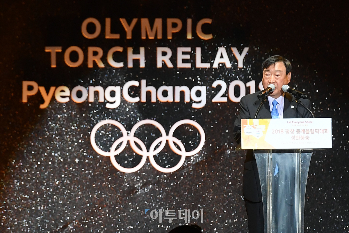 2018 평창동계올림픽 성화봉송이 시작된 1일 인천 연수구 달빛축제공원에서 열린 성화봉송 축하행사에서 이희범 대회조직위원장이 축사를 하고 있다. 이동근 기자 foto@