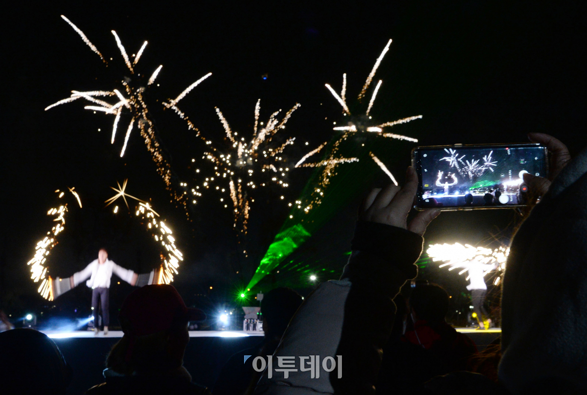 2018 평창동계올림픽 성화봉송이 시작된 1일 인천 연수구 달빛축제공원에서 열린 성화봉송 축하행사에서 한 시민이 화려한 불꽃놀이를 스마트폰으로 담고 있다. 이동근 기자 foto@