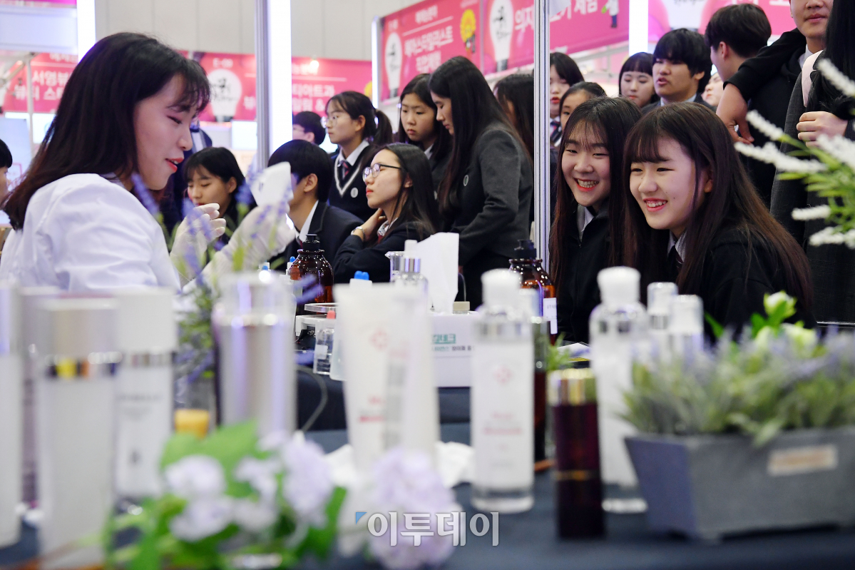 2017 진로·직업체험박람회가 2일 경기 고양시 킨텍스 제2전시장에서 열린 가운데 학생들이 화장품 제작 체험을 하고 있다. 오는 4일까지 열리는 이번 박람회는 초,중,고교생들을 대상으로 다양한 진로정보와 직업체험의 기회를 제공한다. 이동근 기자 foto@