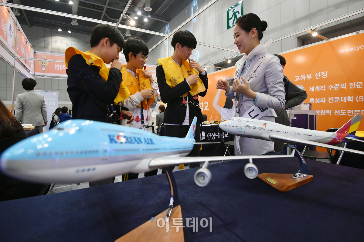 2017 진로·직업체험박람회가 2일 경기 고양시 킨텍스 제2전시장에서 열린 가운데 학생들이 비행기 승무원 체험을 하고 있다. 오는 4일까지 열리는 이번 박람회는 초,중,고교생들을 대상으로 다양한 진로정보와 직업체험의 기회를 제공한다. 이동근 기자 foto@