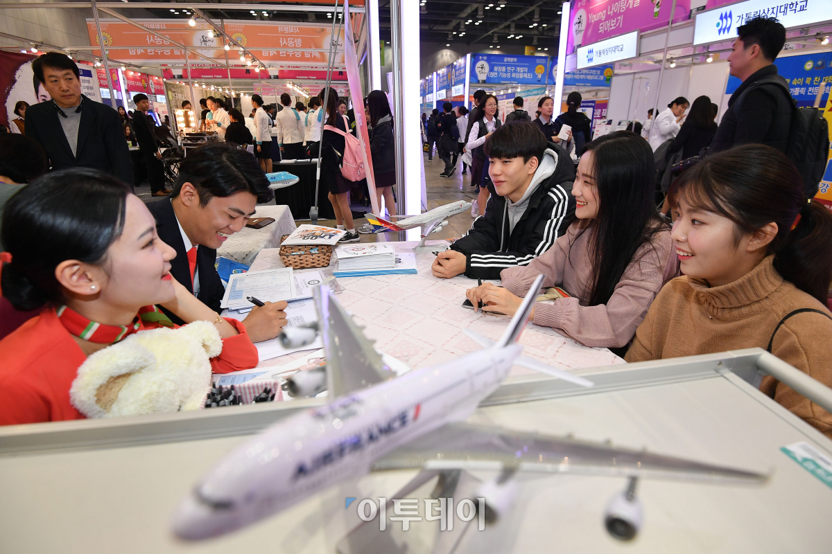 2017 진로·직업체험박람회가 2일 경기 고양시 킨텍스 제2전시장에서 열린 가운데 학생들이 충청대학교 항공관광과 부스에서 진로 상담을 받고 있다. 오는 4일까지 열리는 이번 박람회는 초,중,고교생들을 대상으로 다양한 진로정보와 직업체험의 기회를 제공한다. 이동근 기자 foto@