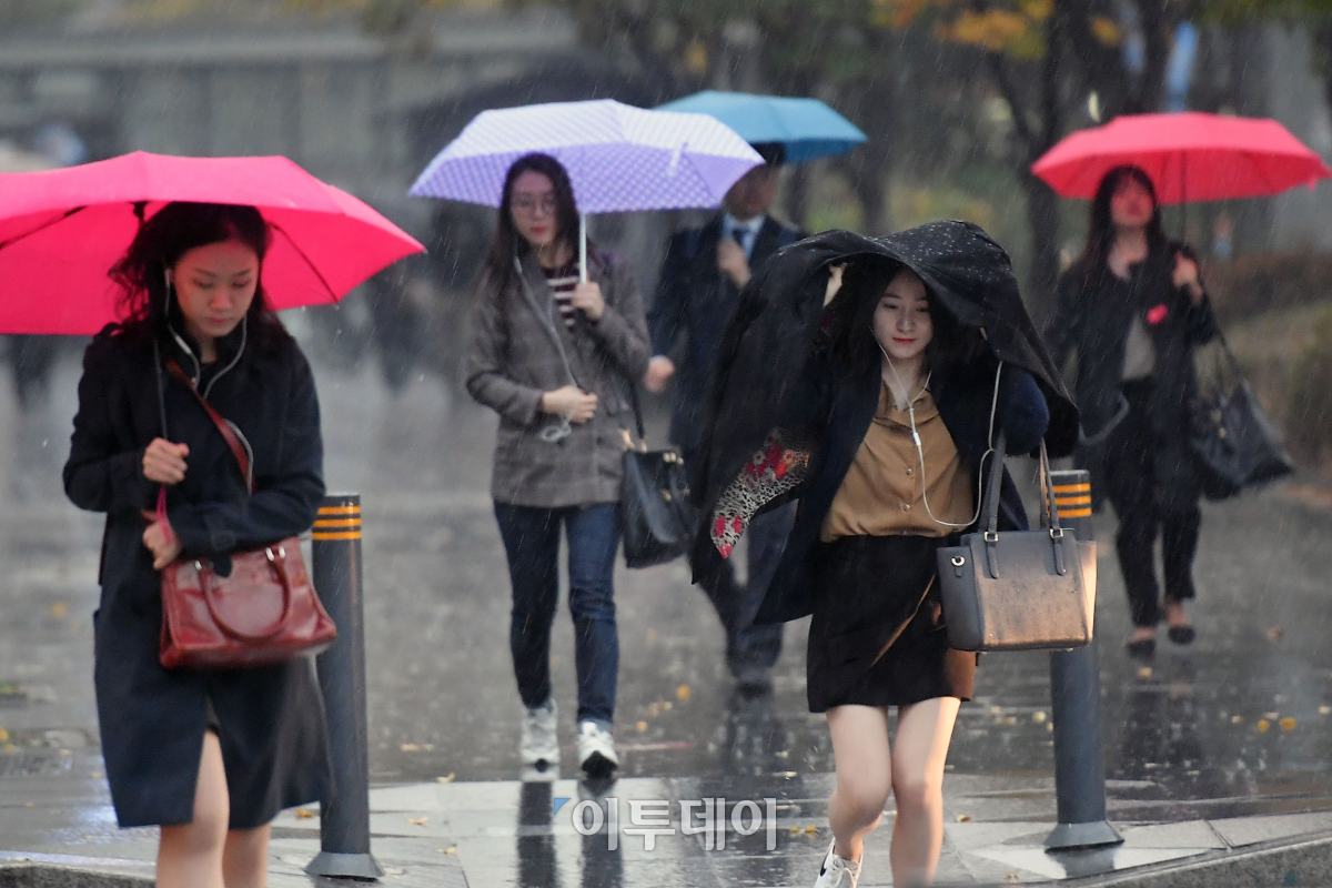 서울을 비롯한 중부지방에 가을비가 내린 3일 오전 서울 여의도역 인근에서 한 시민이 겉옷으로 비를 가린채 발걸음을 재촉하고 있다. 이번 비는 중부지방은 낮까지, 강원도와 경북북부는 밤까지 내리고 비가 그친 후 찬 공기가 유입되면서 기온이 큰 폭으로 떨어져 주말동안 추운 날씨가 이어질 전망이다. 이동근 기자 foto@