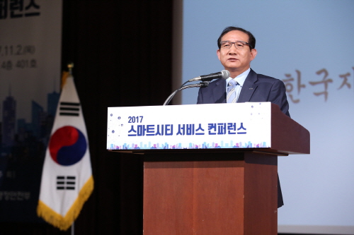 행정안전부가 주최하고 한국지역정보개발원이 주관한 2017년 스마트시티 서비스 컨퍼런스에서 한국지역정보개발원 손연기 원장이 축사를 하고 있다.