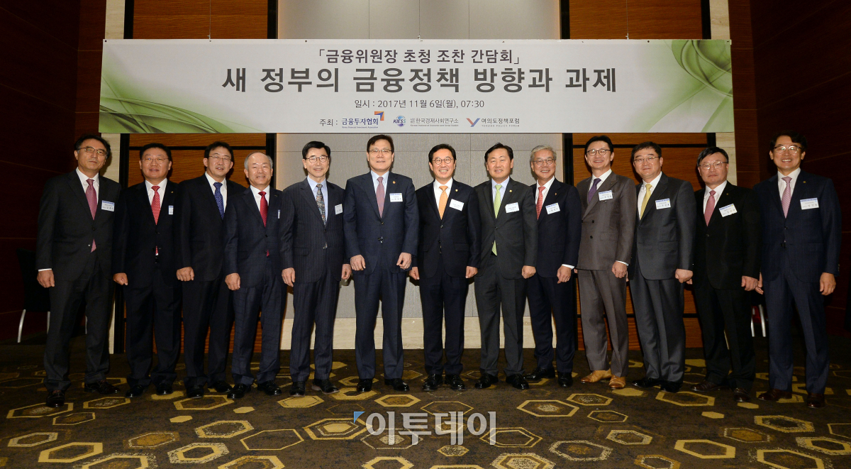 최종구(왼쪽에서 여섯 번째) 금융위원장이 6일 오전 서울 여의도 콘래드호텔에서 열린 초청 조찬간담회에서 황영기(왼쪽에서 아홉 번째) 금융투자협회장, 유종근(왼쪽에서 다섯 번째) 한국경제사회연구원 이사장 등 참석자들과 기념촬영을 하고 있다. 이동근 기자 foto@