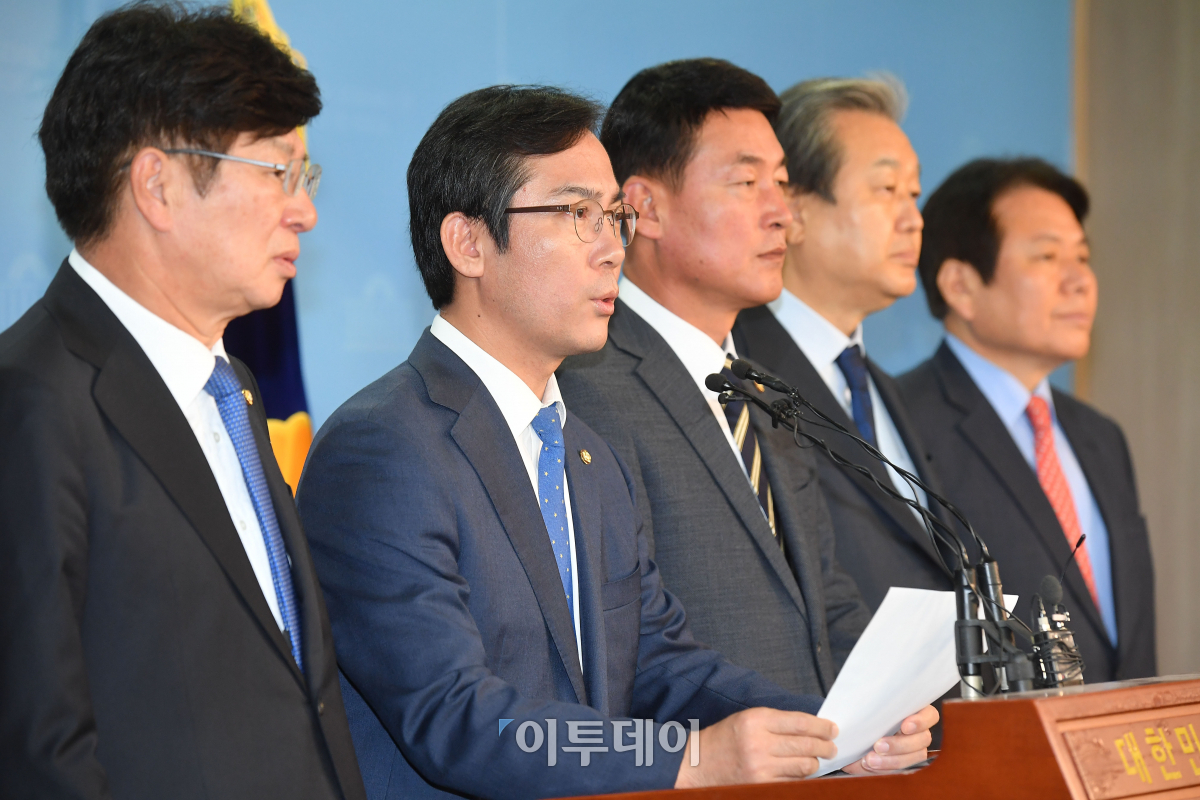 바른정당 통합파 의원들이 6일 서울 여의도 국회 정론관에서 탈당 성명서를 발표하고 있다. 왼쪽부터 이종구, 김영우, 황영철, 김무성, 정양석 의원. 이동근 기자 foto@
