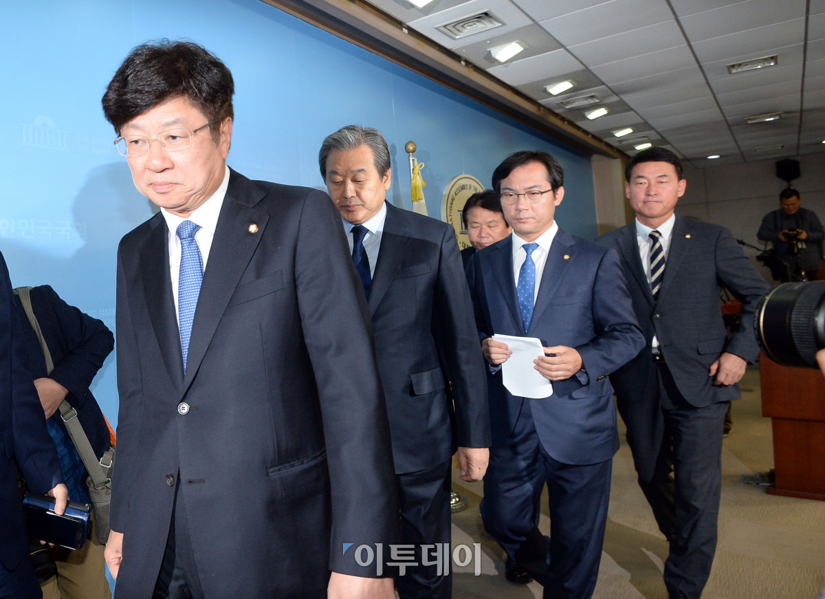 바른정당 통합파 의원들이 6일 서울 여의도 국회 정론관에서 탈당 성명서 발표를 마치고 자리를 이동하고 있다. 왼쪽부터 이종구, 김무성, 정양석, 김영우, 황영철 의원. 이동근 기자 foto@