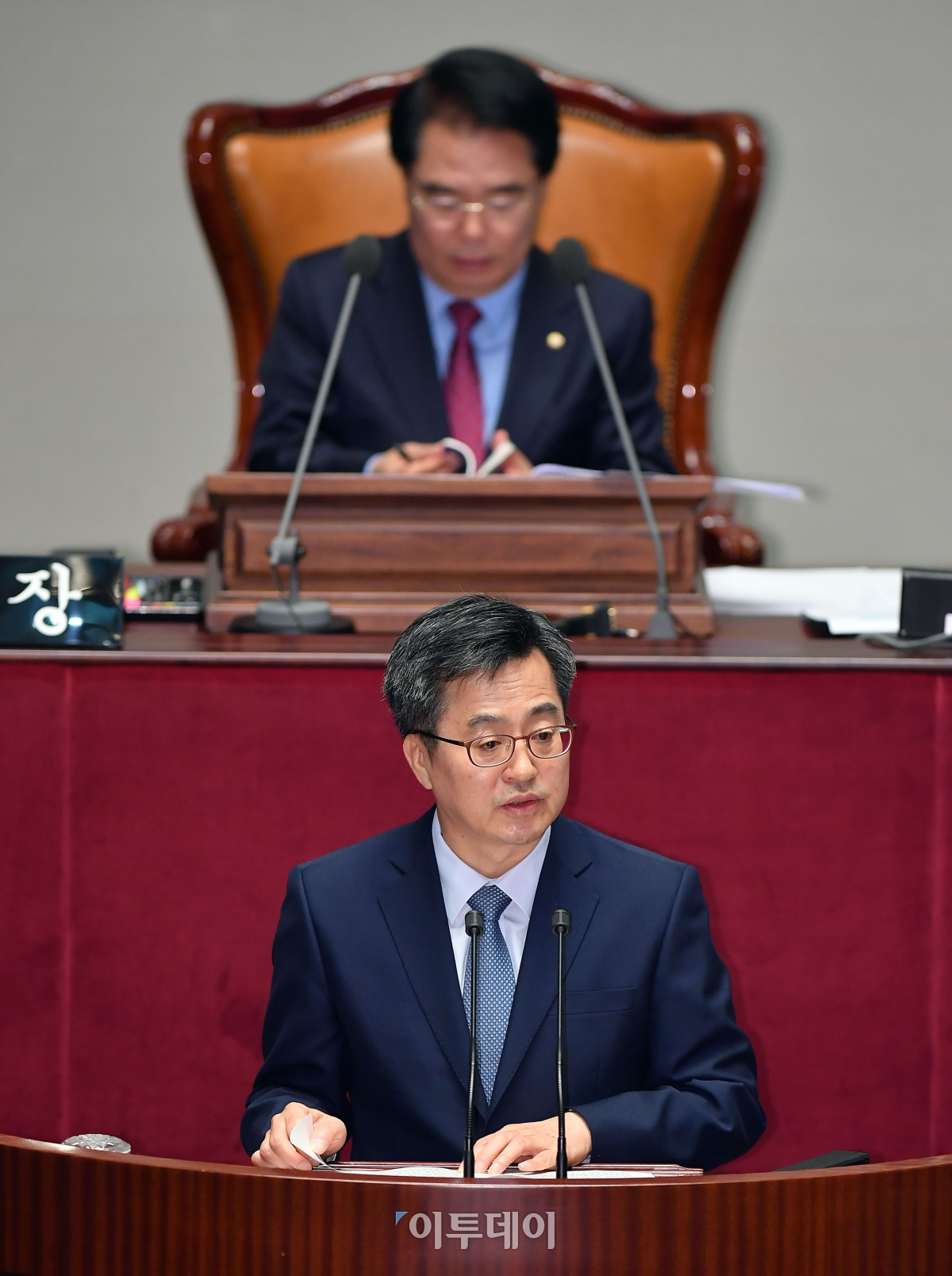 김동연 경제부총리 겸 기획재정부 장관이 2018년도 예산안 논의를 위해 6일 서울 여의도 국회에서 열린 예산결산특별위원회 전체회의에서 예산안 제안설명을 하고 있다. 이동근 기자 foto@