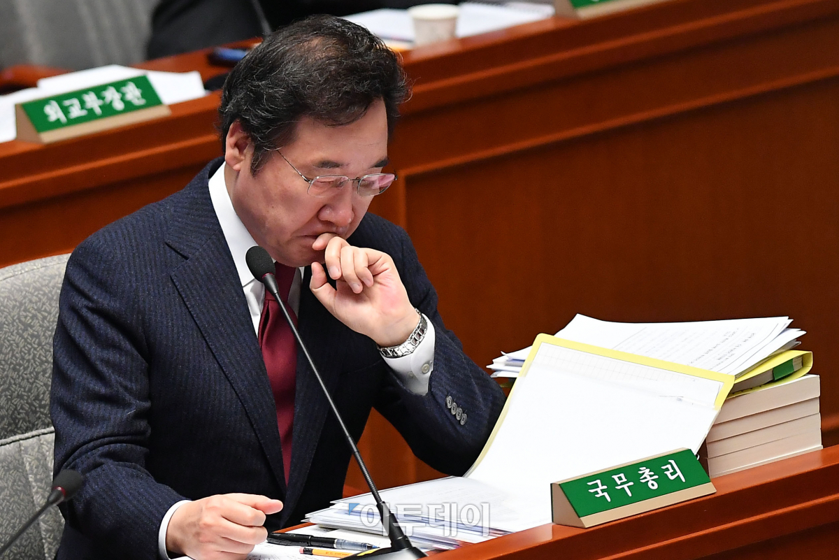 이낙연 국무총리가 2018년도 예산안 논의를 위해 6일 서울 여의도 국회에서 열린 예산결산특별위원회 전체회의에서 자료를 살펴보며 생각에 잠겨 있다. 이동근 기자 foto@