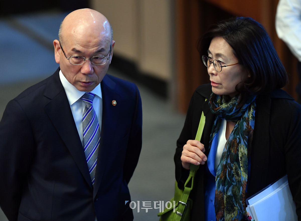 이효성(왼쪽) 방통위원장과 유승희 더불어민주당 의원이 2018년도 예산안 논의를 위해 6일 서울 여의도 국회에서 열린 예산결산특별위원회 전체회의에서 대화하고 있다. 이동근 기자 foto@
