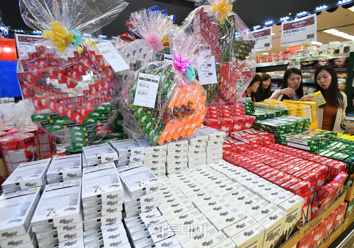 빼빼로데이를 닷새 앞둔 6일 서울 중구 롯데마트 서울역점에 마련된 빼빼로 행사장에서 시민들이 다양한 제품을 살펴보고 있다. 이동근 기자 foto@