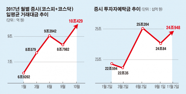 코스피지수가 연일 신기록 행진을 거듭하면서 증시로 밀려드는 자금의 행렬도 가파르게 증가하고 있다. 하루 7조 원까지 쪼그라들었던 증시 거래대금은 하루 평균 10조 원을 넘어섰고 증시 진입을 기다리는 투자자예탁금도 사상 최대를 기록했다.