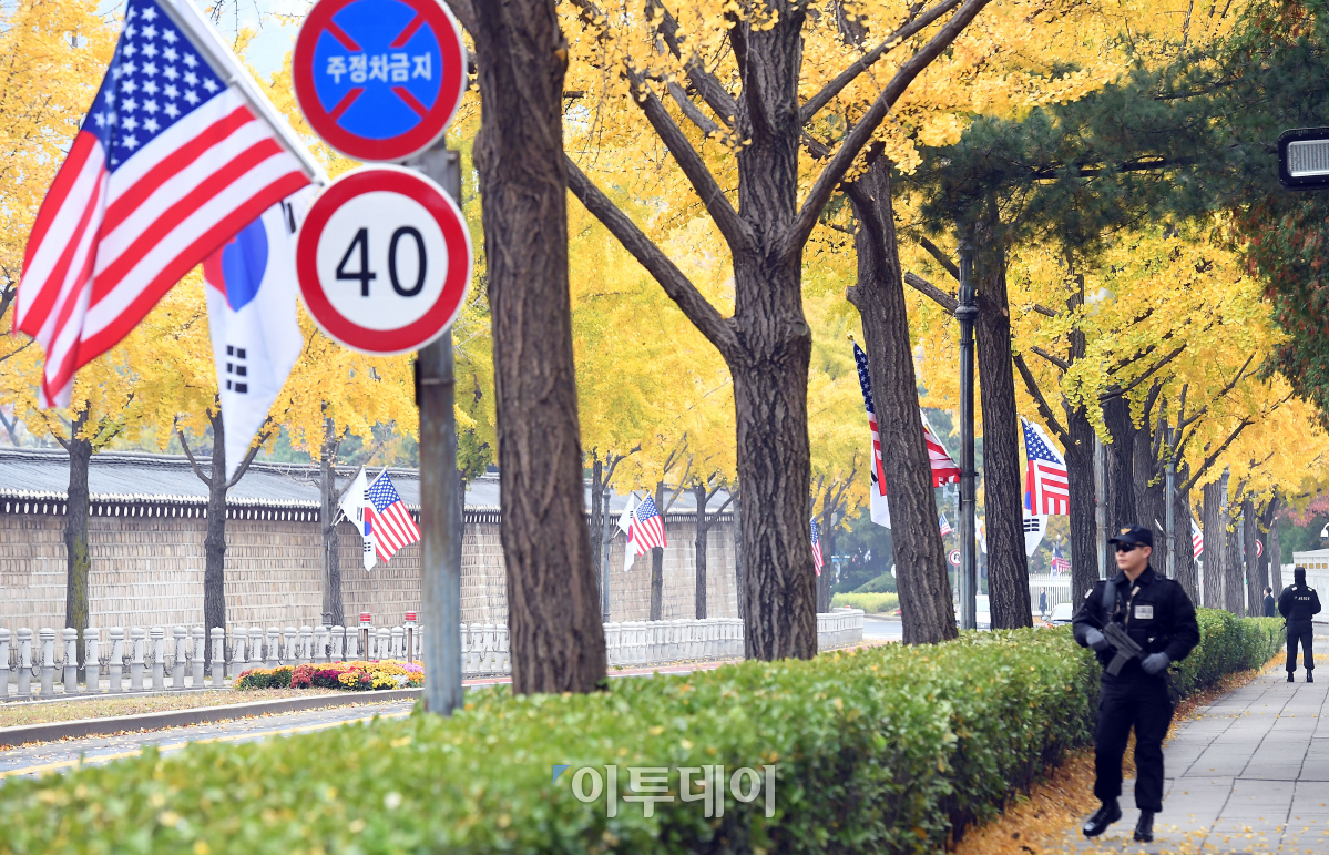 도널드 트럼프 미국 대통령이 국빈자격으로 방한하는 7일 오전 청와대 앞길에서 경찰이 경계근무를 서고 있다. 이동근 기자 foto@
