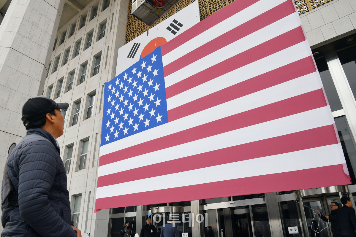 도널드 트럼프 미국 대통령의 국회연설을 하루 앞둔 7일 서울 여의도 국회에서 관계자들이 본청 벽면에 태극기와 성조기를 걸고 있다. 이동근 기자 foto@