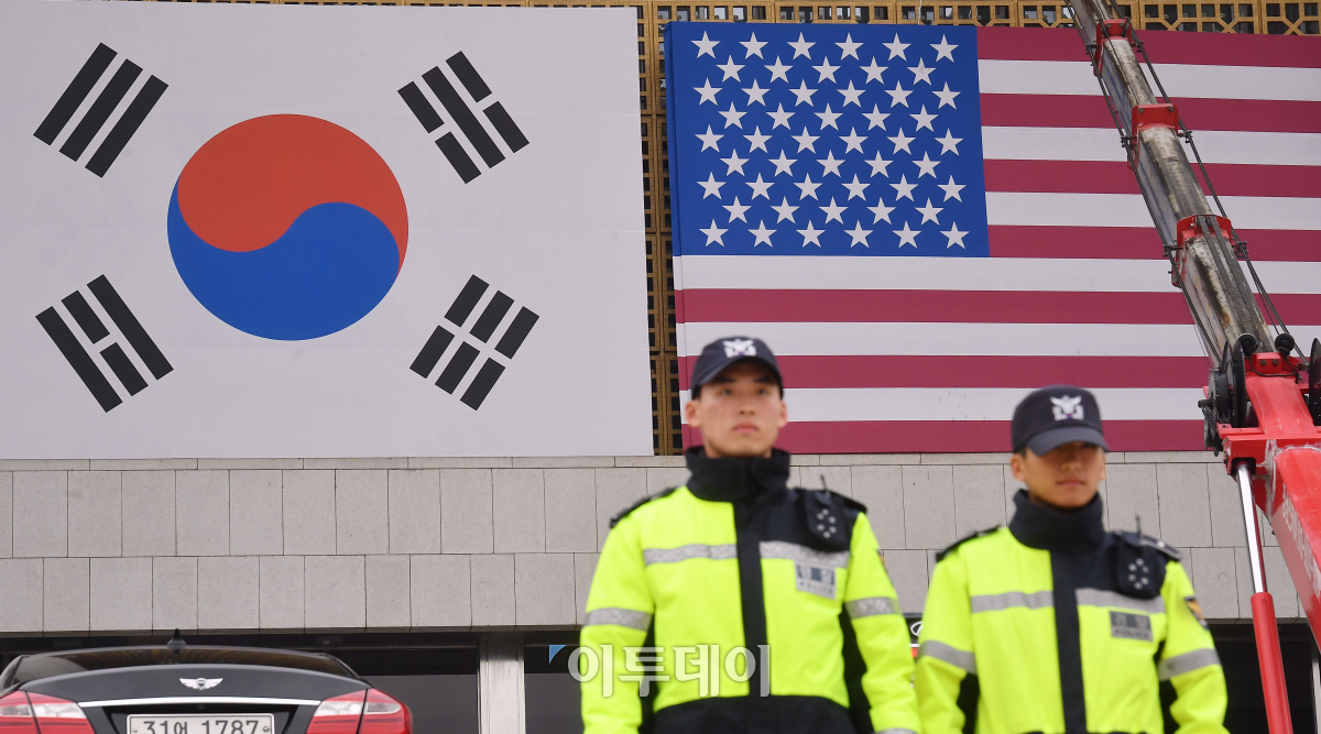 도널드 트럼프 미국 대통령의 국회연설을 하루 앞둔 7일 서울 여의도 국회에서 관계자들이 본청 벽면에 태극기와 성조기를 걸고 있다. 이동근 기자 foto@