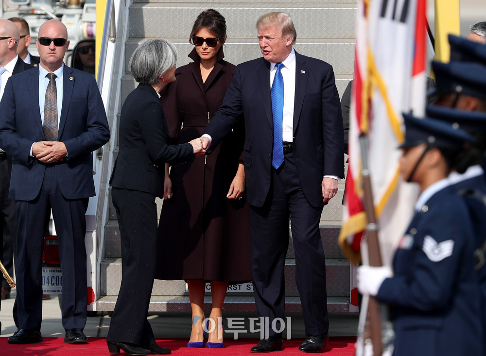 도널드 트럼프 미국 대통령과 부인 멜라니아 여사가 7일 오후 경기도 평택시 주한미군 오산공군 기지에 도착, 강경화 외교부장관과 악수를 나누고 있다. 사진공동취재단