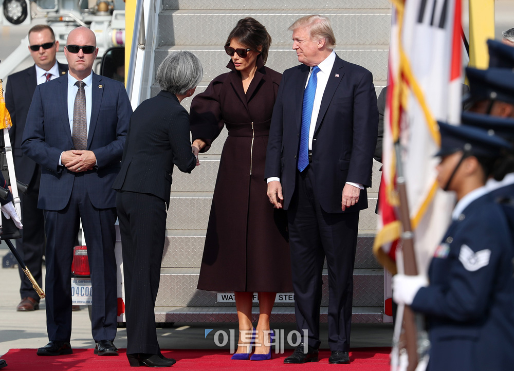 도널드 트럼프 미국 대통령과 부인 멜라니아 여사가 7일 오후 경기도 평택시 주한미군 오산공군 기지에 도착, 강경화 외교부장관과 악수를 나누고 있다. 사진공동취재단