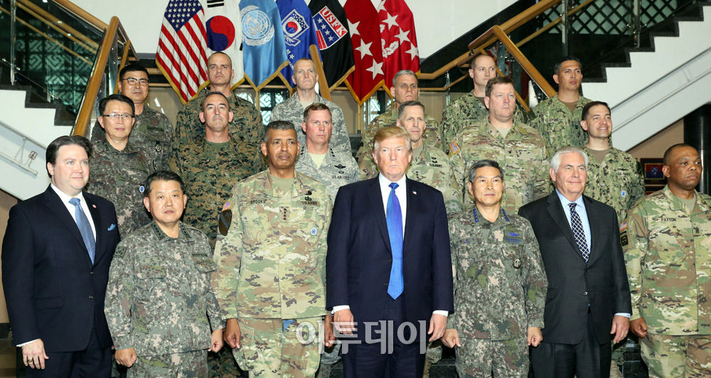 도널드 트럼프 미국 대통령이 7일 경기도 평택 캠프 험프리에 도착해 미8군 사령부 상황실에서 기념촬영을 하고있다. 사진공동취재단