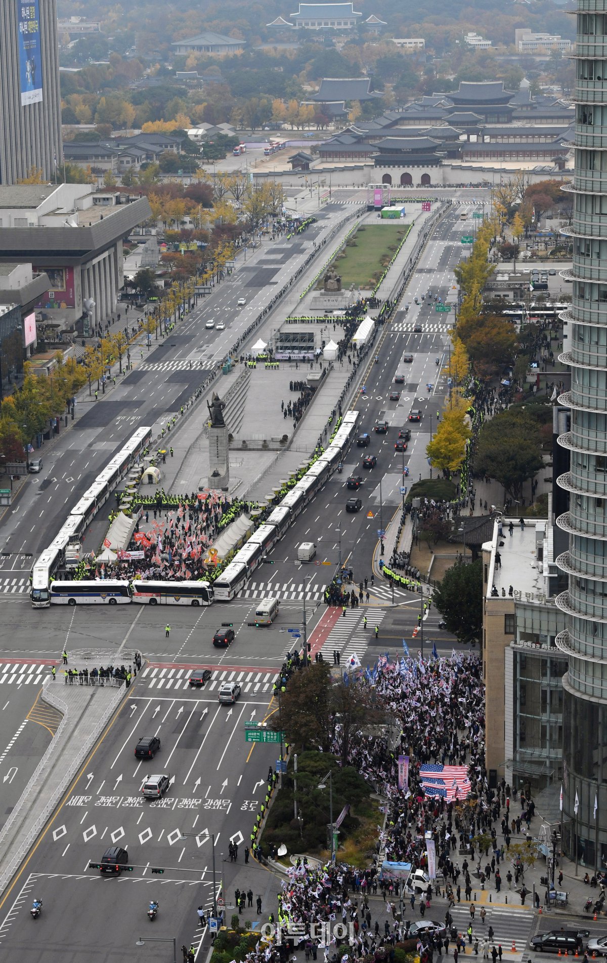국빈 방한한 도널드 트럼프 미국 대통령이 탑승한 차량행렬이 7일 서울 세종대로를 지나 청와대로 향하고 있다. 행렬 왼쪽으로 방한 반대집회, 오른쪽으로 환영집회가 열리고 있다. 이동근 기자 foto@