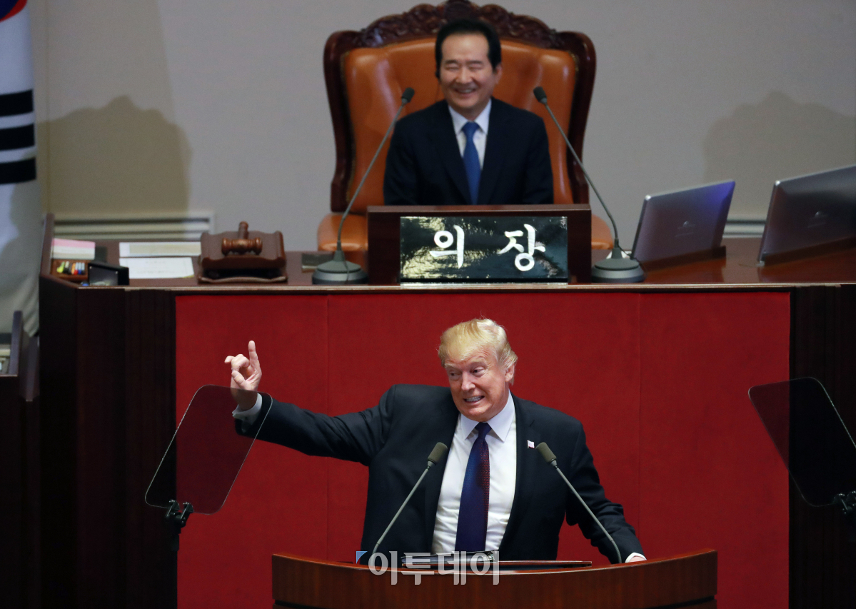 도널드 트럼프 미국 대통령이 8일 서울 여의도 국회 본회의장에서 연설을 하고 있다. 이번 국회 연설은 미국 역대 대통령 중 7번째로, 1993년 빌 클린턴 대통령에 이어 24년 만이다. 사진공동취재단