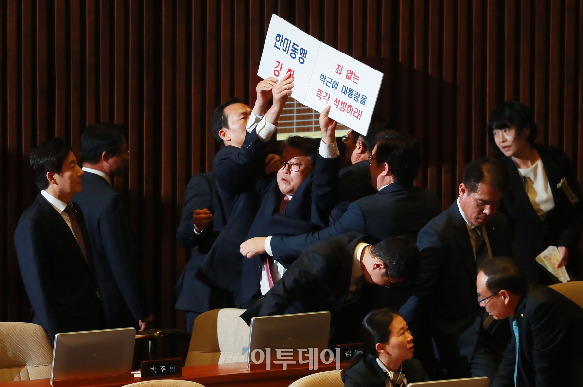 국빈 방문 중인 도널드 트럼프 미국 대통령의 국회연설이 예정된 8일 오전 조원진 대한애국당 의원이 국회 본회의장 피켓을 들고 입장하던 중 경위들에게 제지당하고 있다. 사진공동취재단