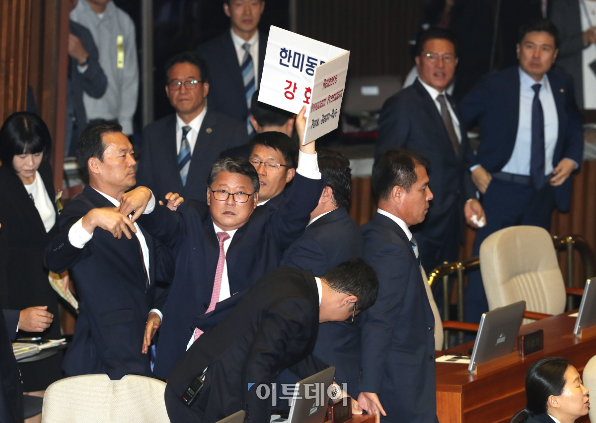 국빈 방문 중인 도널드 트럼프 미국 대통령의 국회연설이 예정된 8일 오전 조원진 대한애국당 의원이 국회 본회의장 피켓을 들고 입장하던 중 경위들에게 제지당하고 있다. 사진공동취재단