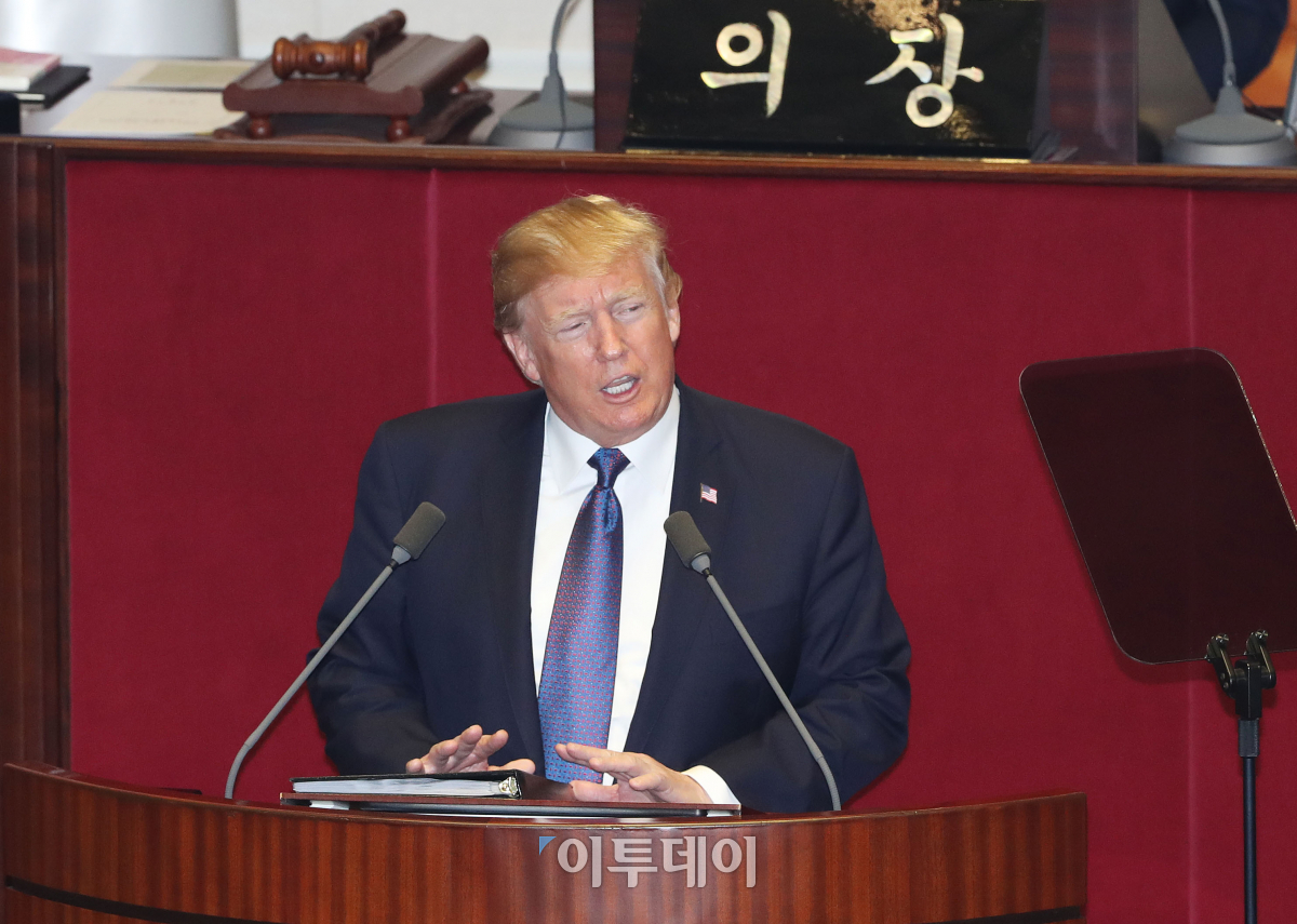 도널드 트럼프 미국 대통령이 8일 서울 여의도 국회 본회의장에서 연설을 하고 있다. 이번 국회 연설은 미국 역대 대통령 중 7번째로, 1993년 빌 클린턴 대통령에 이어 24년 만이다. 사진공동취재단