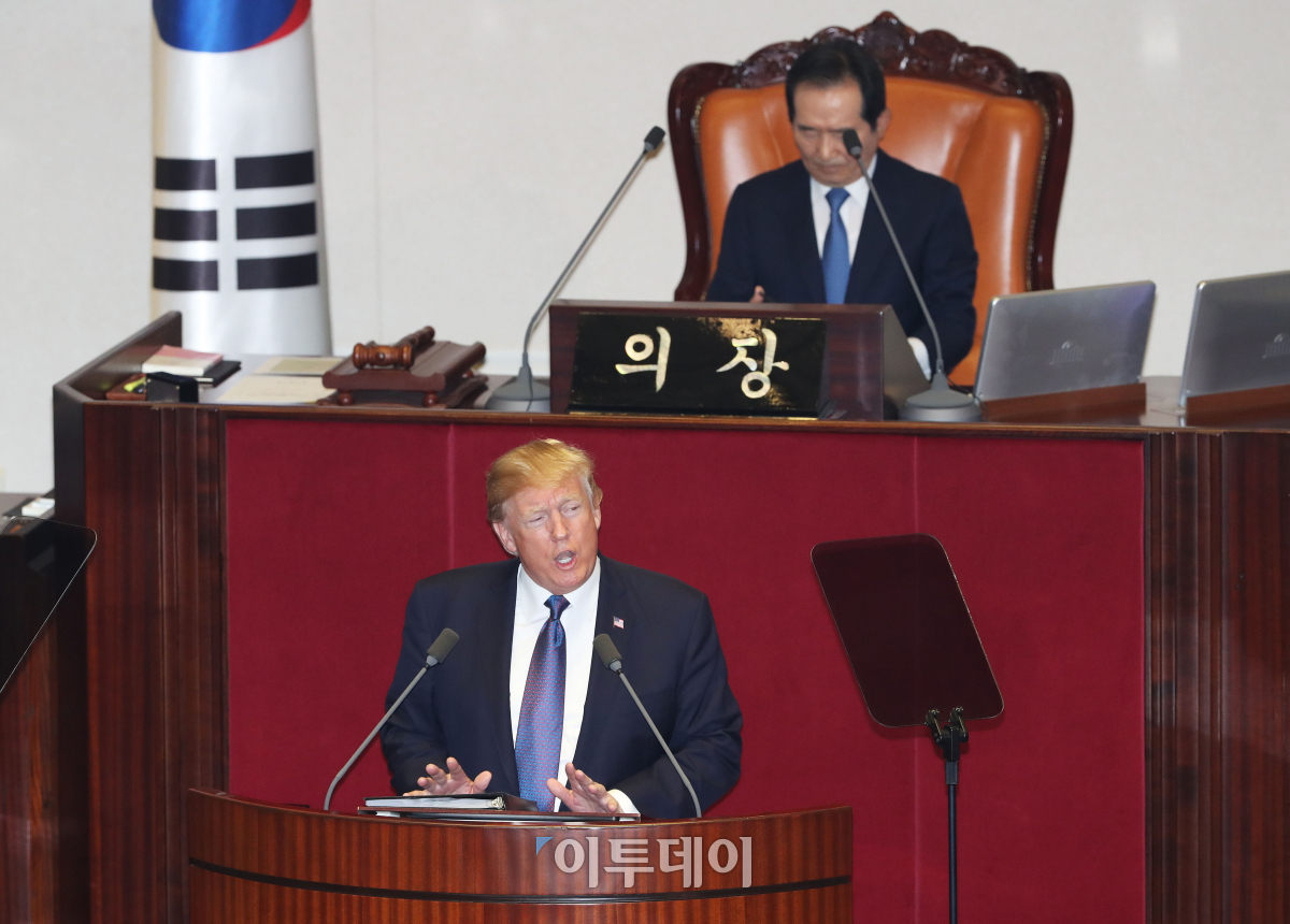 도널드 트럼프 미국 대통령이 8일 서울 여의도 국회 본회의장에서 연설을 하고 있다. 이번 국회 연설은 미국 역대 대통령 중 7번째로, 1993년 빌 클린턴 대통령에 이어 24년 만이다. 사진공동취재단