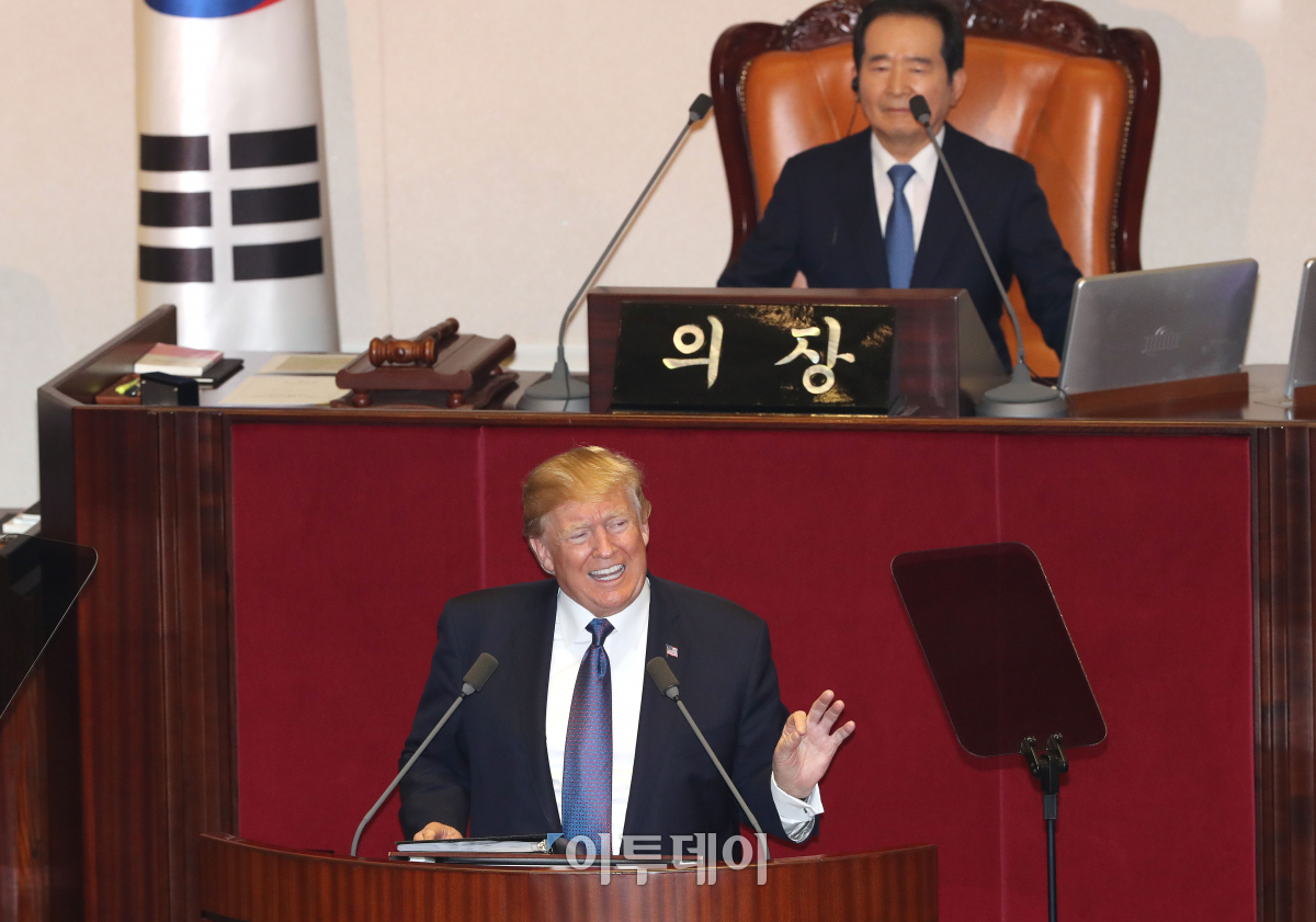 도널드 트럼프 미국 대통령이 8일 서울 여의도 국회 본회의장에서 연설을 하고 있다. 이번 국회 연설은 미국 역대 대통령 중 7번째로, 1993년 빌 클린턴 대통령에 이어 24년 만이다. 사진공동취재단