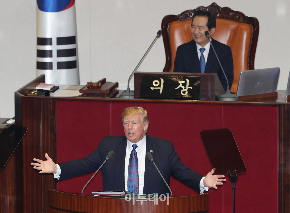 도널드 트럼프 미국 대통령이 8일 서울 여의도 국회 본회의장에서 연설을 하고 있다. 이번 국회 연설은 미국 역대 대통령 중 7번째로, 1993년 빌 클린턴 대통령에 이어 24년 만이다. 사진공동취재단