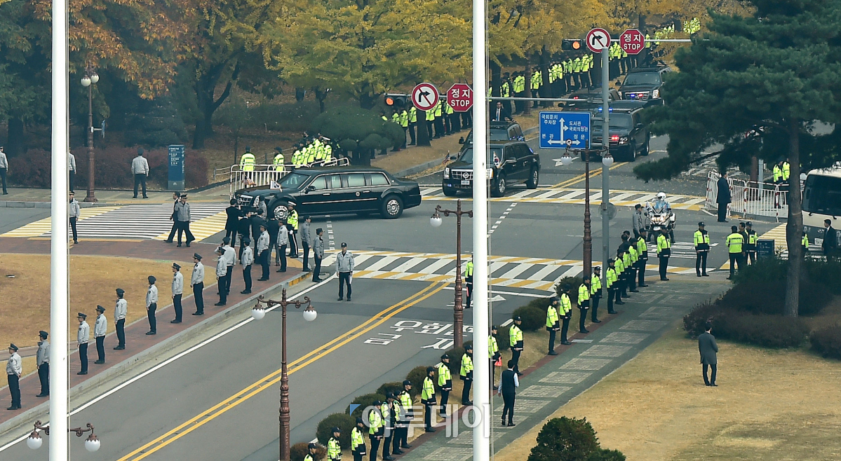 국회 연설을 앞둔 도널드 트럼프 미국 대통령이 탄 차량 행렬이 8일 서울 여의도 국회 본관으로 향하고 있다. 사진공동취재단