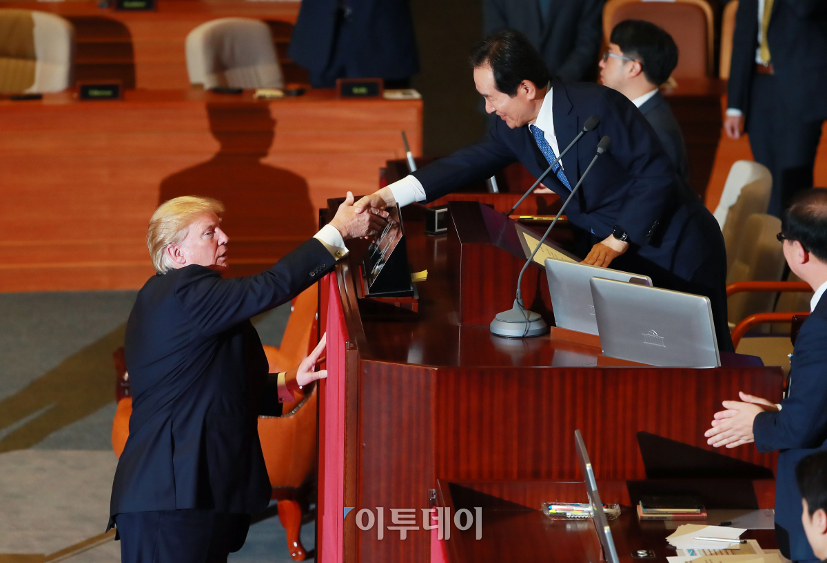국빈 방문 중인 도널드 트럼프 미국 대통령이 8일 오전 서울 여의도 국회 본회의장에서 연설을 마친뒤 정세균 국회의장과 악수를 하고 있다. 이번 국회 연설은 미국 역대 대통령 중 7번째로, 1993년 빌 클린턴 대통령에 이어 24년 만이다. 사진공동취재단