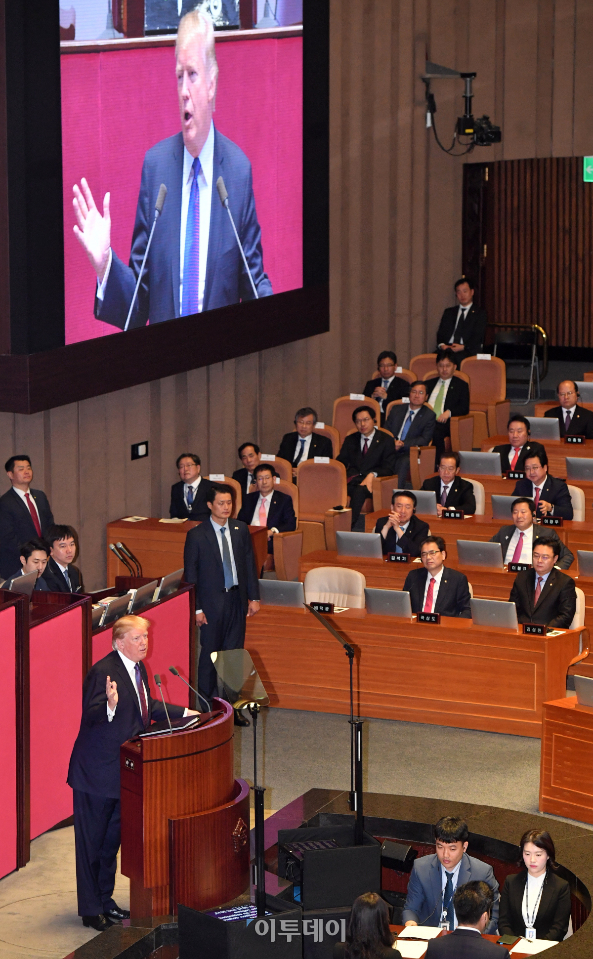 도널드 트럼프 미국 대통령이 8일 서울 여의도 국회 본회의장에서 연설을 하고 있다. 이번 국회 연설은 미국 역대 대통령 중 7번째로, 1993년 빌 클린턴 대통령에 이어 24년 만이다. 사진공동취재단