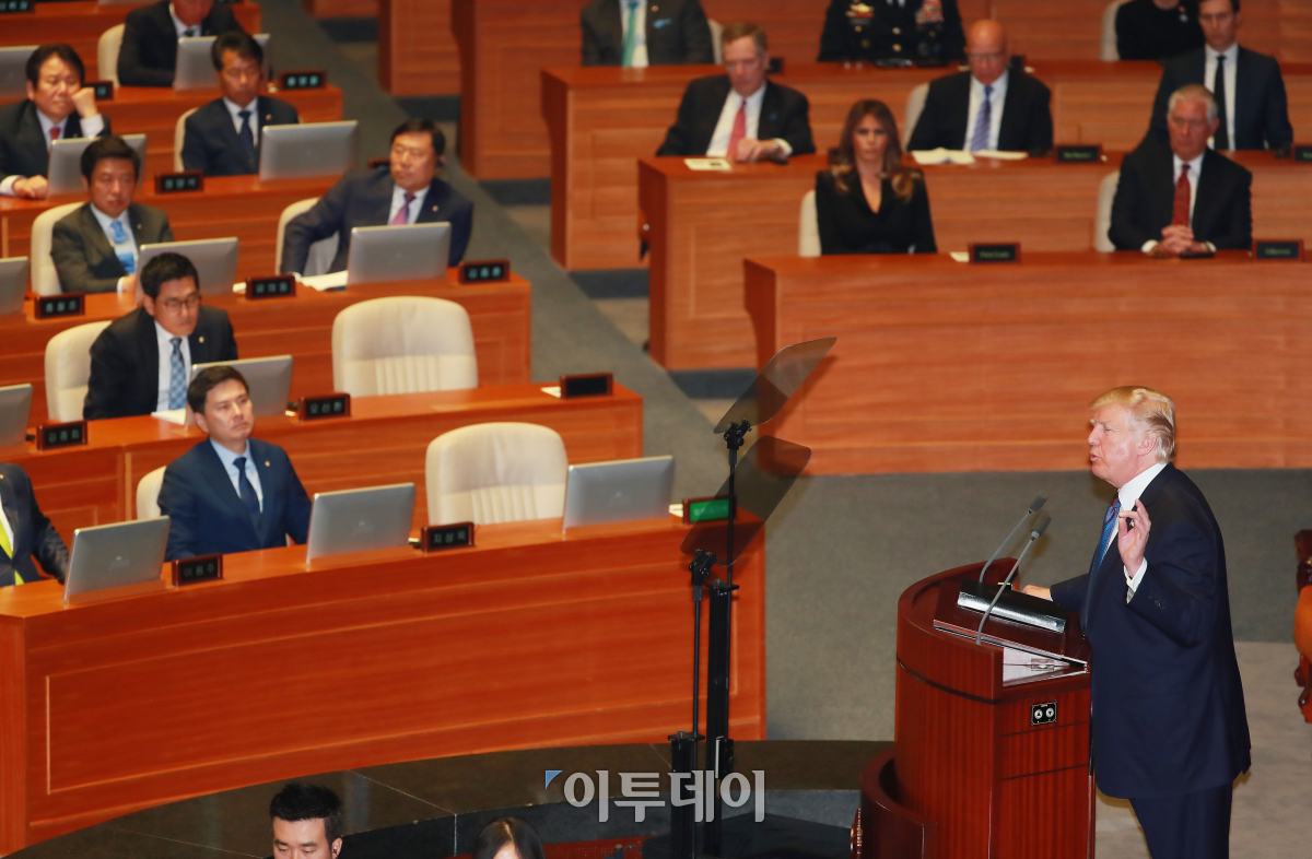 도널드 트럼프 미국 대통령이 8일 서울 여의도 국회 본회의장에서 연설을 하고 있다. 이번 국회 연설은 미국 역대 대통령 중 7번째로, 1993년 빌 클린턴 대통령에 이어 24년 만이다. 사진공동취재단