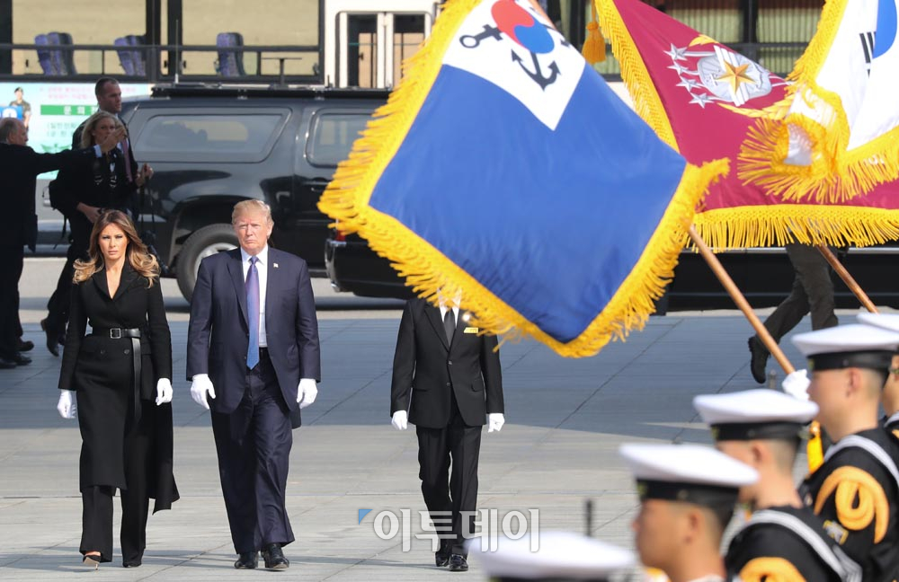 방한중인 도널드 트럼프 미국 대통령과 멜라니아 여사가 8일 서울 동작구 국립현충원을 참배하고 있다. 사진공동취재단