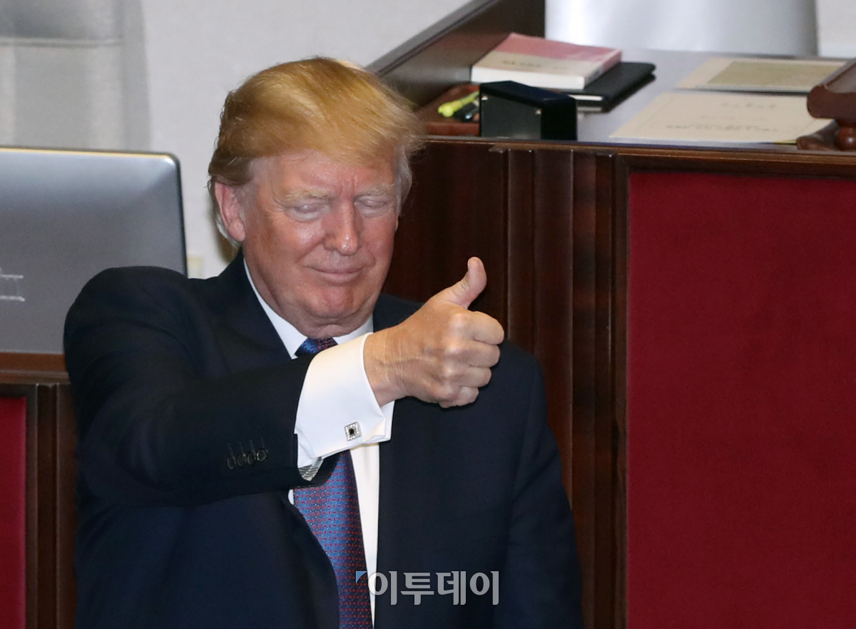 국빈 방문 중인 도널드 트럼프 미국 대통령이 8일 오전 서울 여의도 국회 본회의장에서 연설을 마친뒤 엄지손가락을 들어 환호에 답하고 있다. 이번 국회 연설은 미국 역대 대통령 중 5번째로, 1993년 빌 클린턴 대통령에 이어 24년 만이다. 사진공동취재단